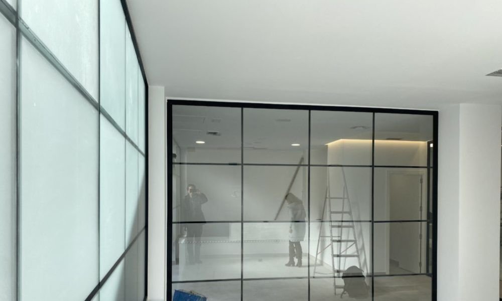 - Pose de parois vitrées atelier avec structure aluminium noir.