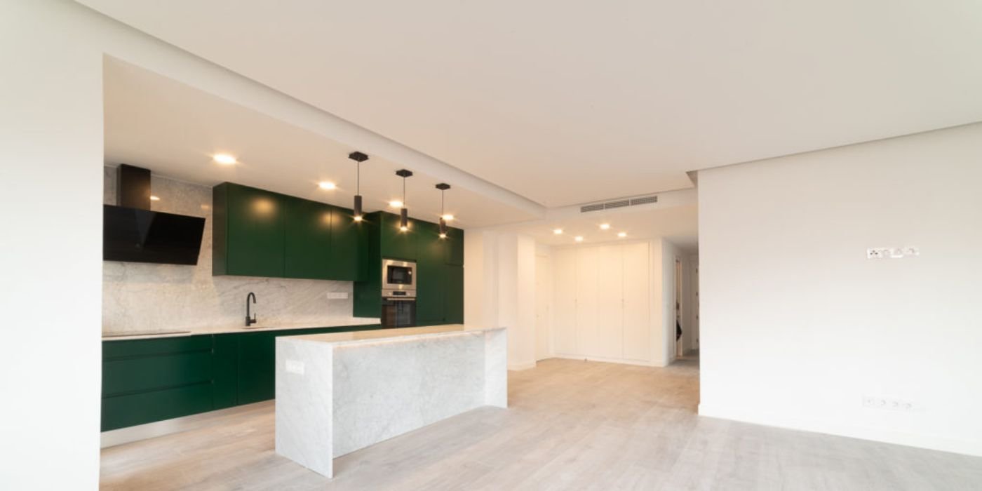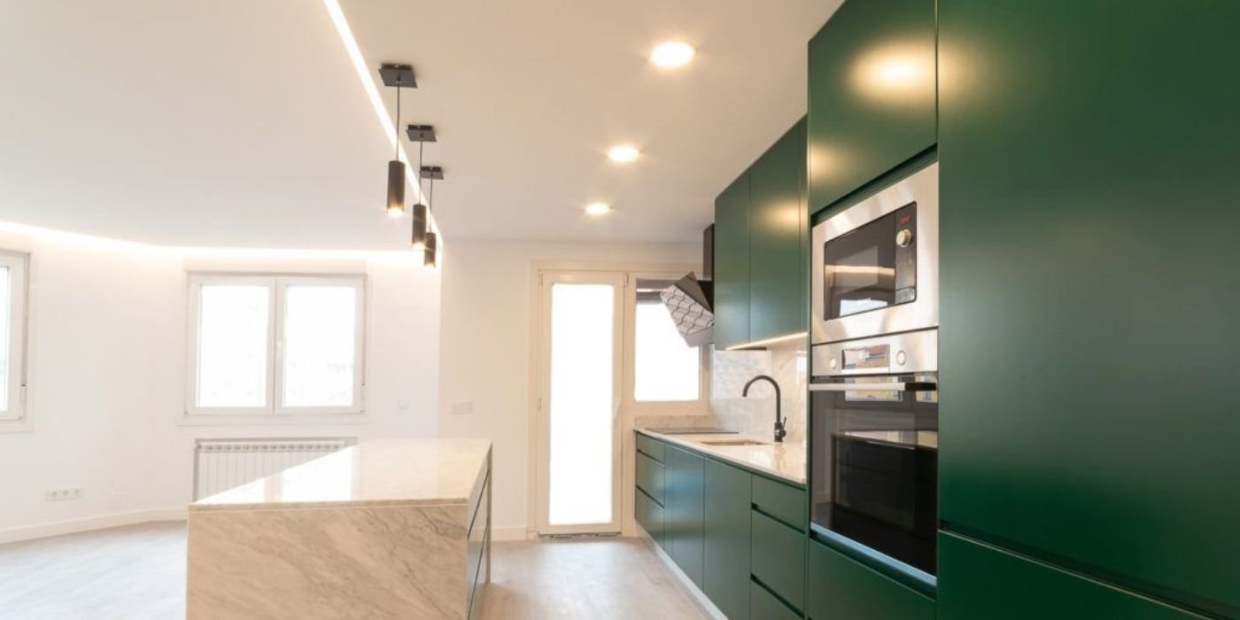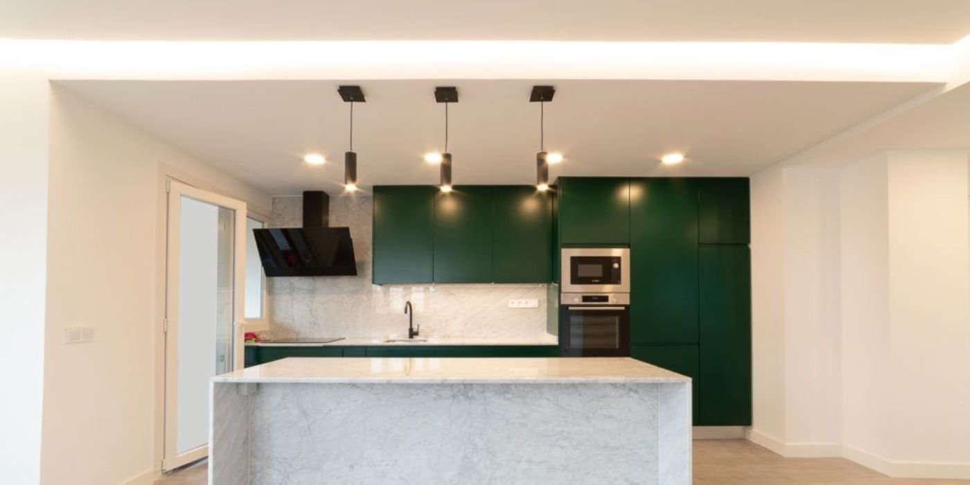La cuisine a été entièrement repensée autour d’un îlot central effet marbre. Les façades vert foncé mat contrastent avec les murs blancs et le parquet clair. Les électroménagers encastrés, la robinetterie noire et les suspensions design apportent modernité et élégance.