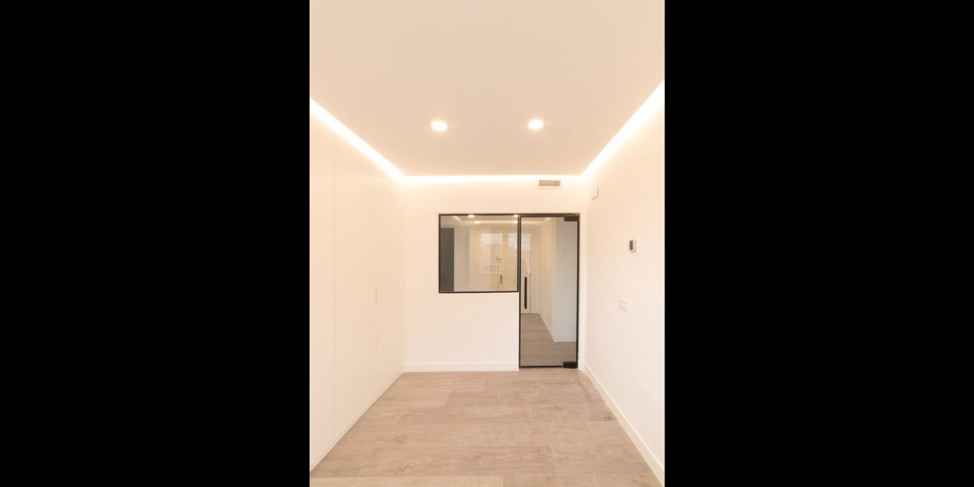 Un faux plafond avec bandeaux LED périphériques et spots encastrés a été mis en place. Ce système assure une ambiance douce et homogène, idéale pour un appartement de taille moyenne.