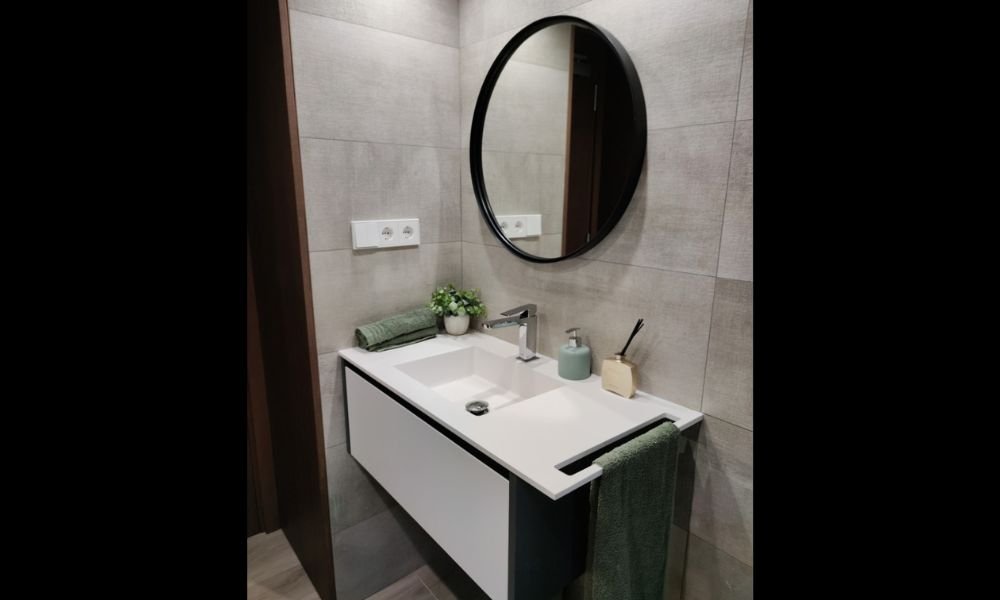 - Miroir rond cadre noir : accent graphique qui agrandit visuellement l’espace.
